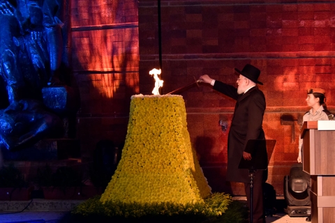 Photo: Rabbi Israel Meir Lau, Chairman of the Yad Vashem Council, lights the Memorial Torch during their 2022 ceremony. Photo credit: Yad Vaschem.