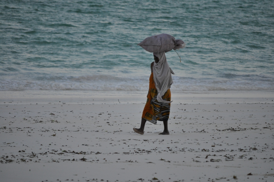 A woman carries seaweed from her underwater farm to the market, Zanzibar