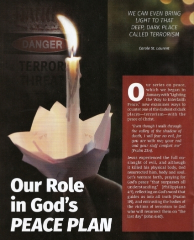 Our peace series in Liguorian magazine, which began with Lighting the Way to Interfaith Peace in January, continues by examining one of the most darkest valleys humans encounter — acts of terrorism. How do we counteract hate in order to prevent as much violence as possible? And when acts of terrorism do occur, how to do we respond, forgive and heal its onslaught so it doesn't lead us into a cycle of even more violence? The surest way I know is by following God's peace plan. This peace plan is for everyone, regardless of their faith, but it is supernaturally difficult — it is loving our enemies, countering hate with love, recognising our common humanity instead of superficial differences. My article, Our Role in God's Peace Plan, is copyright Liguori Publications, 2018, but they kindly allowed me to cross-post it below. Please visit Liguorian.org to learn more and subscribe.