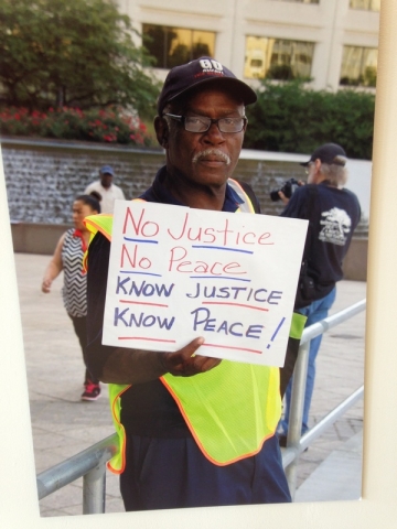 - A man holds a sign, "No Justice No Peace; Know Justice Know Peace" at the 50th anniversary of Martin Luther King Jr.'s assassination, Atlanta 2018 (Credit: Carole St. Laurent)