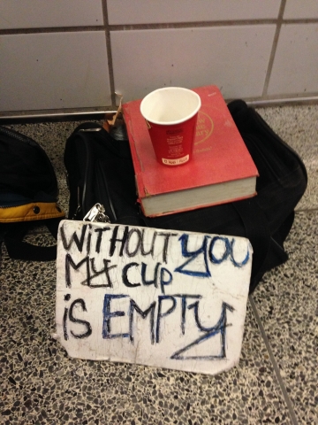 I saw his bed first – a sleeping bag covered by a blue tarp outside a bus shelter on a busy Toronto corner, but it was neither sheltered nor private. A steady stream of people passed it on their way to the nearby offices, shops and hospitals, collars turned up against the cold. Descending the steps to the subway, I saw a man in the corridor, sitting on a Webster’s dictionary. Another similarly-sized tome rested on a bag beside him; whether to sit on or read, I didn’t yet know. He held a full cup of hot coffee in one hand; an empty coffee cup rested on the book, behind a handwritten sign that read, “My cup is empty without you.”