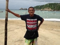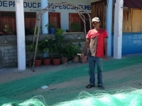 On my tour of Puerto Angel yesterday, I said hi to many people, who responded with smiles and greetings: women pushing baby strollers as their toddlers ran ahead laughing; women sweeping porches, men at work, or looking for passengers for their taxis; shopkeepers, youth and waiters. But yesterday I promised to tell you about Flavio, the old fisherman who was mending his net when I walked back...